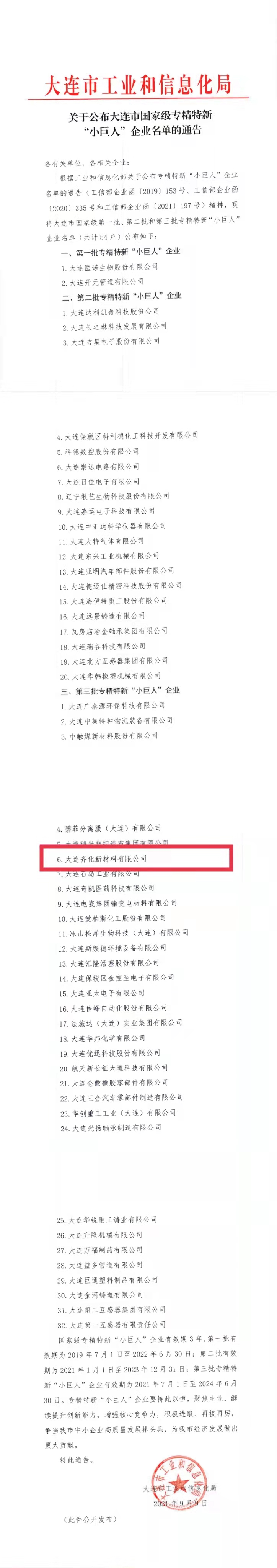 大連齊化新材料被認定為國家級“專精特新”小巨人企業